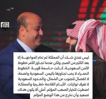 علق الإعلامي المعروف عمرو أديب على الأزمة القائمة بين السعودية والإمارات في اليمن، مشيرًا إلى أن الأيام القادمة ستكون صعبة وحساسة. وقال أديب: "المملكة اضطرت لاتخاذ خيار صعب ومؤلم، وأملي ألا يشهد الوضع تصعيدًا يزيد من تعقيد الأزمة".